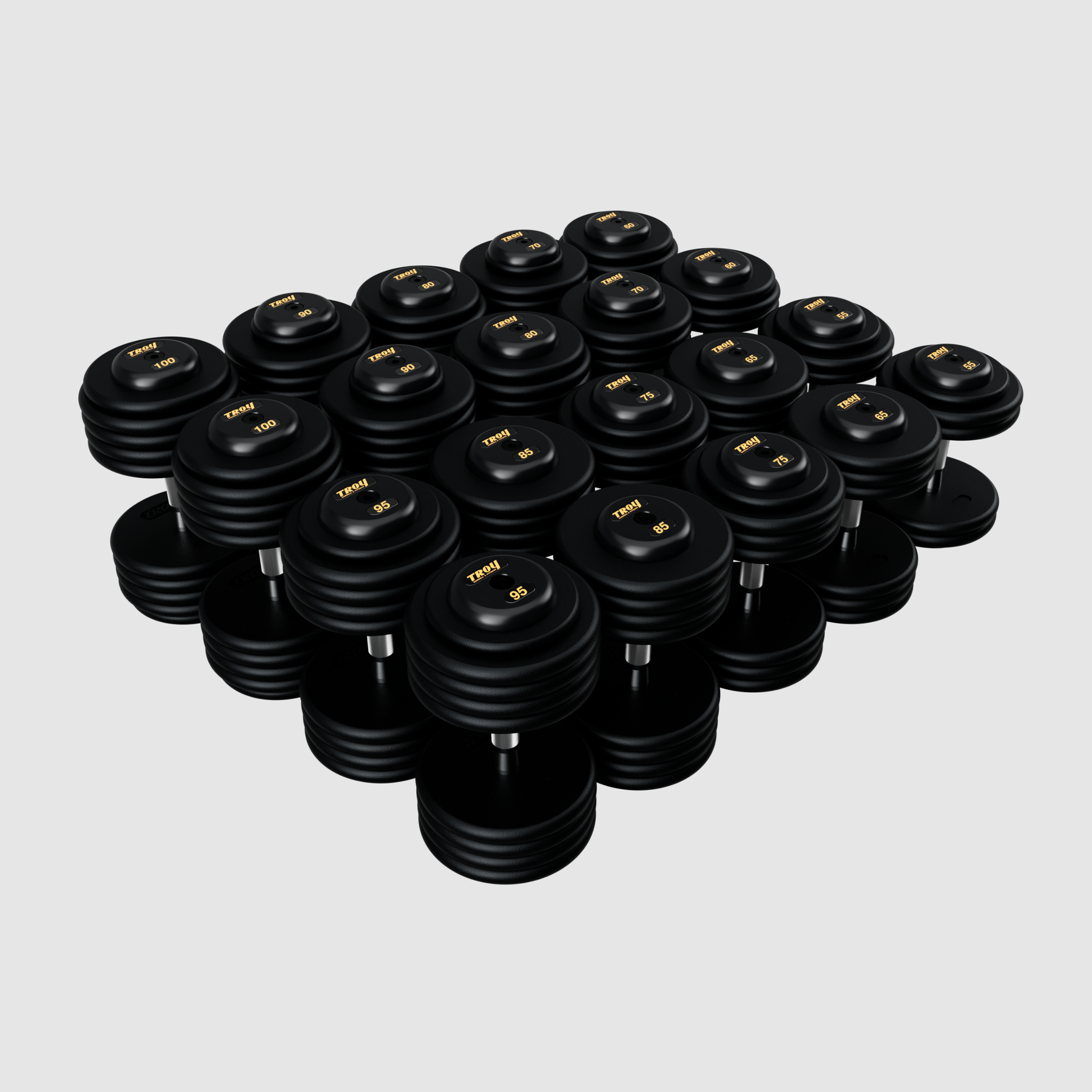 Our TROY pro-style dumbbells are all professionally pre-assembled by us to ensure that they meet the standards required in heavy use, commercial applications. All dumbbells utilize bigger, steel alloy bolts that are longer and stronger than the competition. PFDC-R dumbbells featured here consist of 32 mm contoured handles with special deep set knurling for functional performance and Troy premium grade, black textured, machined plates. The steel, rubber encased end caps include the TROY name and numbers tags for easy identification. Available in 2.5 lb increments starting at 5 lb up to 52.5 lb and in 5 lb increments up to 150 lb.