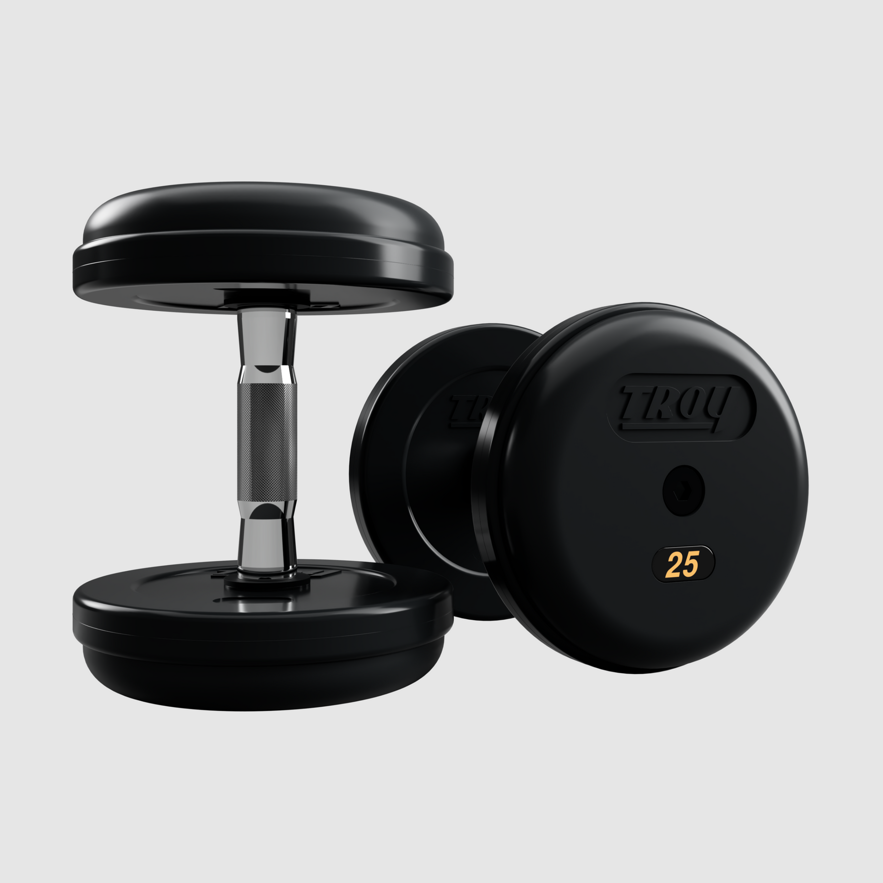 Our rubber encased TROY pro style dumbbells are all pre-assembled to ensure that they meet the standards required in heavy use commercial applications. All of our pro style dumbbells use solid steel bolt design; bigger, longer and stronger than the competition. These dumbbells consist of straight or contoured handles that feature special deep set knurling for functional performance and our top of the line TROY rubber encased plates. The rubber end caps include the TROY name and numbers for easy identification. Available in 2.5 lb increments starting at 5 lb up to 52.5 lb and in 5 lb increments up to 120 lb.
